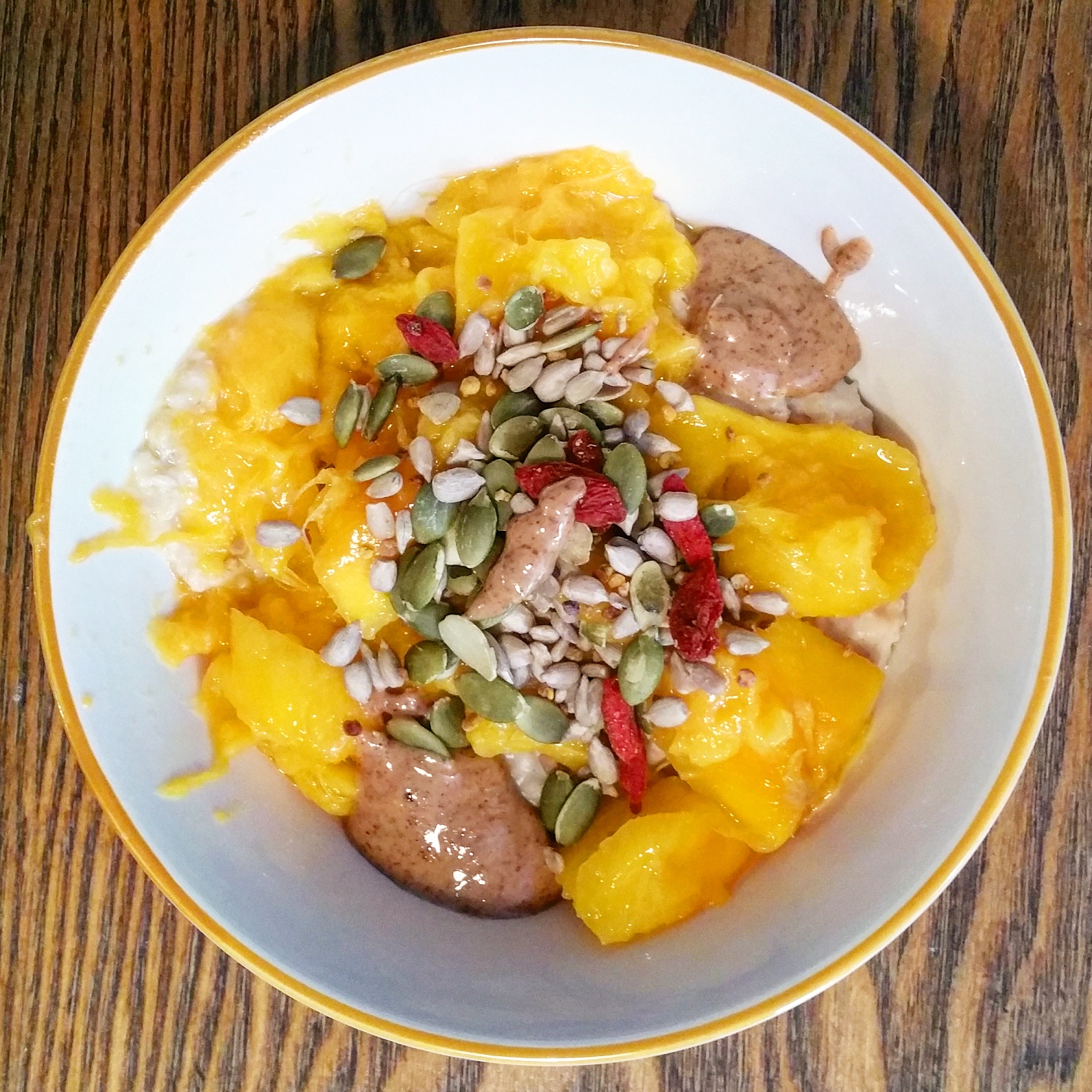 Almond porridge topped with mango, Pip & Nut Almond and Coconut Butter (Tribe – Discover) and Goji Berry, Bee Pollen and Seeds Sachet (Tribe – Sustain)