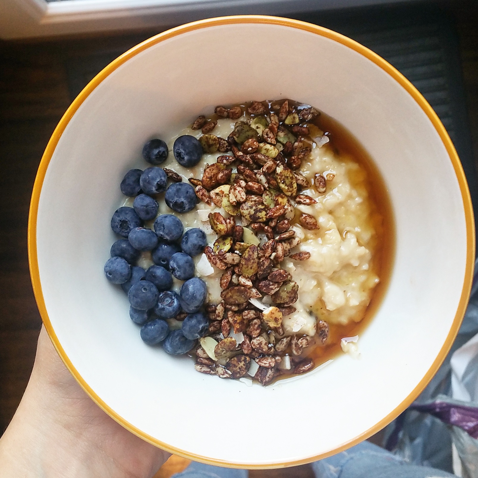 Oat milk and sultana porridge, fresh blueberries, pure maple syrup and Cacao Seeds (Tribe – Plenish)